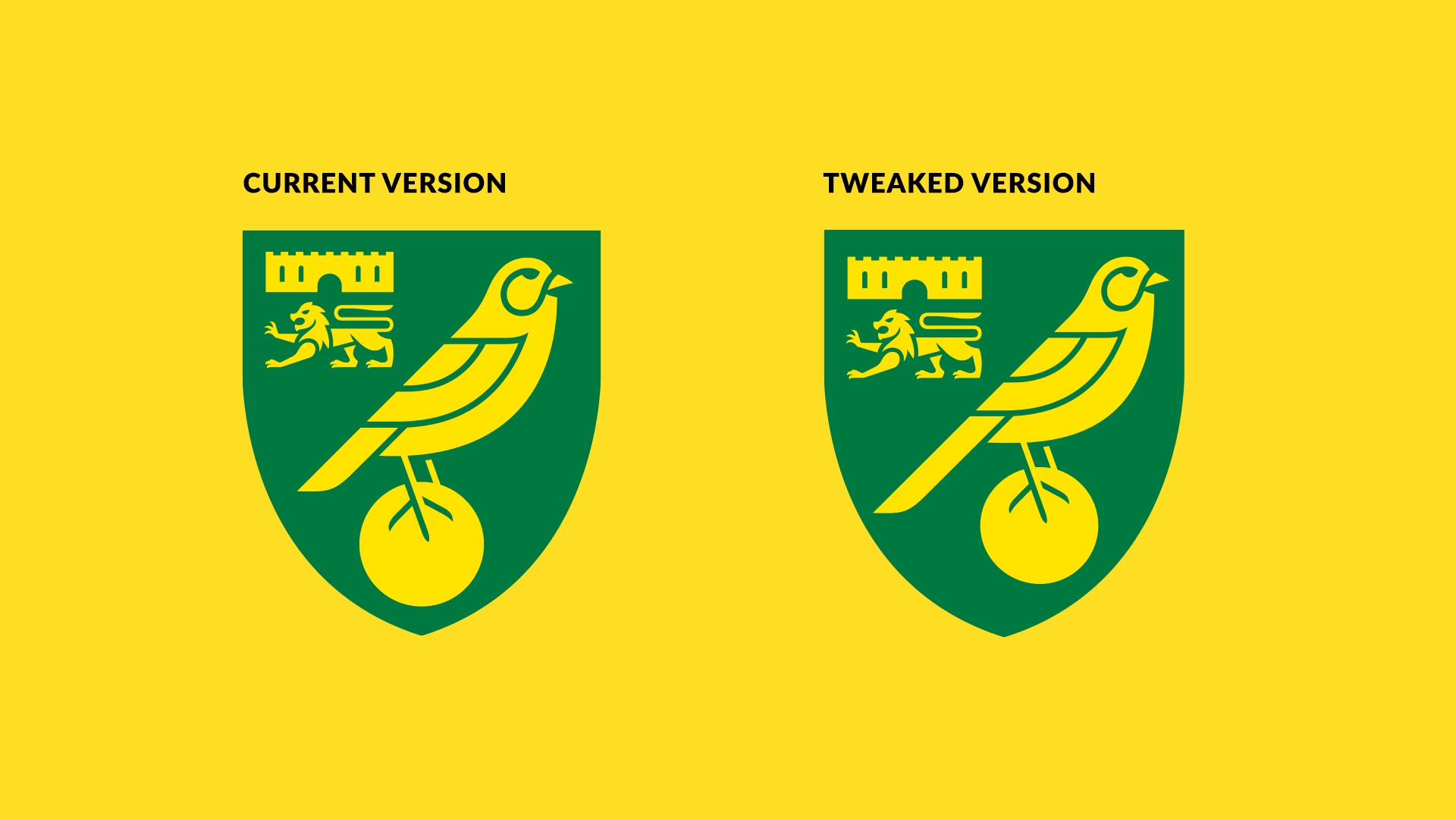 The general consensus from supporters has been positive and we’re in agreement. But as creatives ourselves we couldn’t help but give this logo a little analysis. If we had to be fussy, which we do for the sake of the article of course, our only tiny niggle is the placement of the ball. We understand that by centering the ball it is supposed to give the overall crest an even balance but we feel the proportion of the iconic canary itself looks a tad… off. By moving the ball to the centre, the size of the tail has been slightly reduced resulting in the legs being pushed. The results have caused our little canary to look a little top heavy. Just for fun we have created a slightly tweaked version of the crest to showcase the canary slightly to the right.